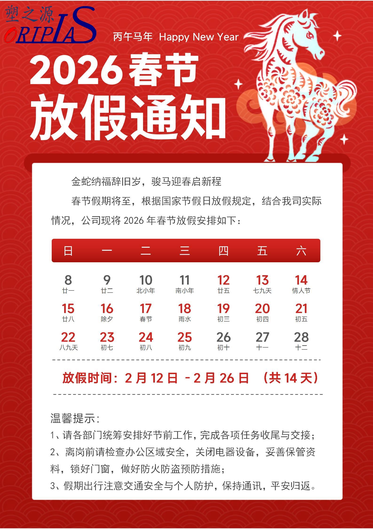 骏马迎春 福满新元|江苏奥瑞斯/塑之源机械2026年放假通知